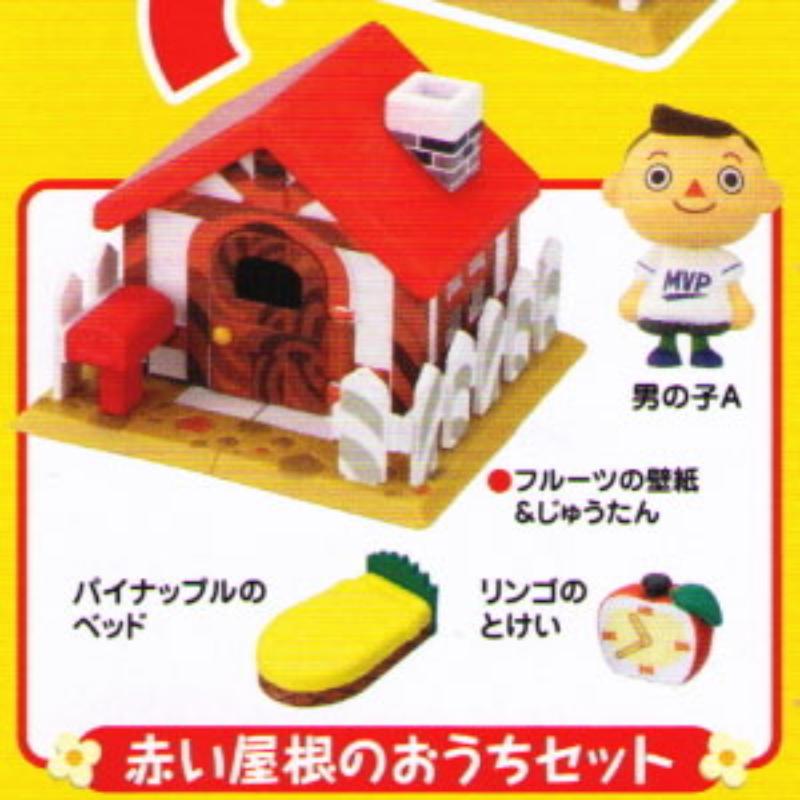 Adorable gashopon figures meaning they are originally packaged in those plastic egg vending machines. These figures are based on the Wii version but unfortunately there�s no Captain on the bus. Included here are a genki looking boy with a pineapple bed and an apple clock to adorn his red roofed house.