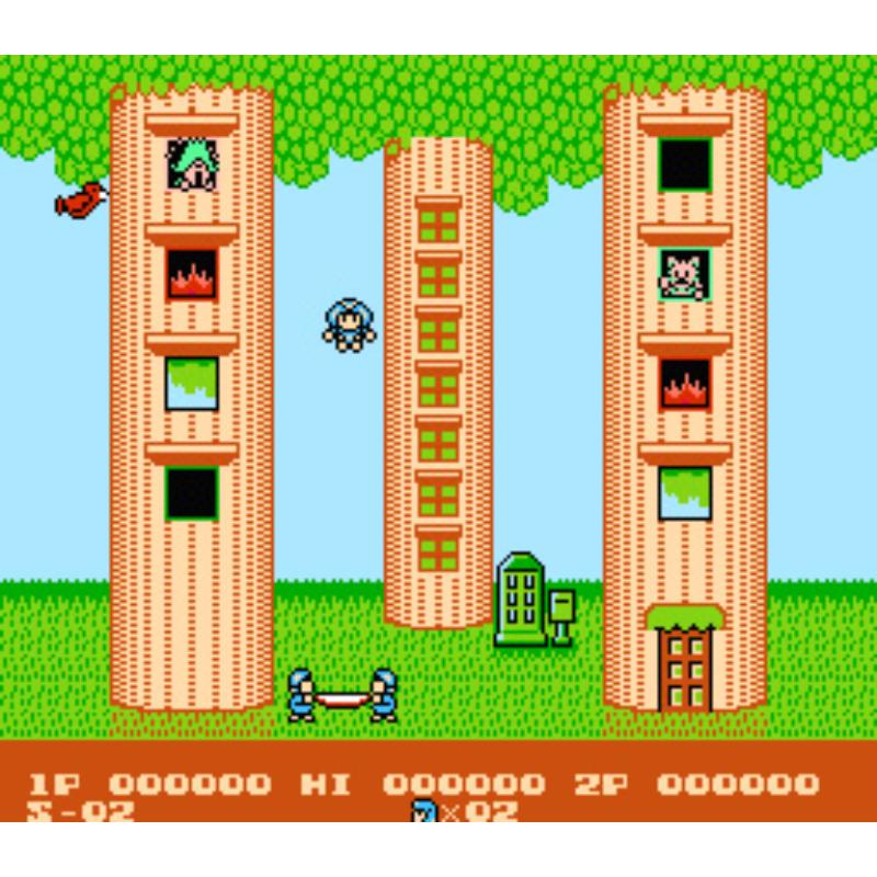 From the day where gameplay always took priority, playing as a fireman you manoeuvre a trampoline around the screen to bounce you colleague up to rescue people trapped in the buildings above or to extinguish the fires. Various creatures can be tactically used to gain extra height by bouncing off them and power ups add to the arcadey feel.