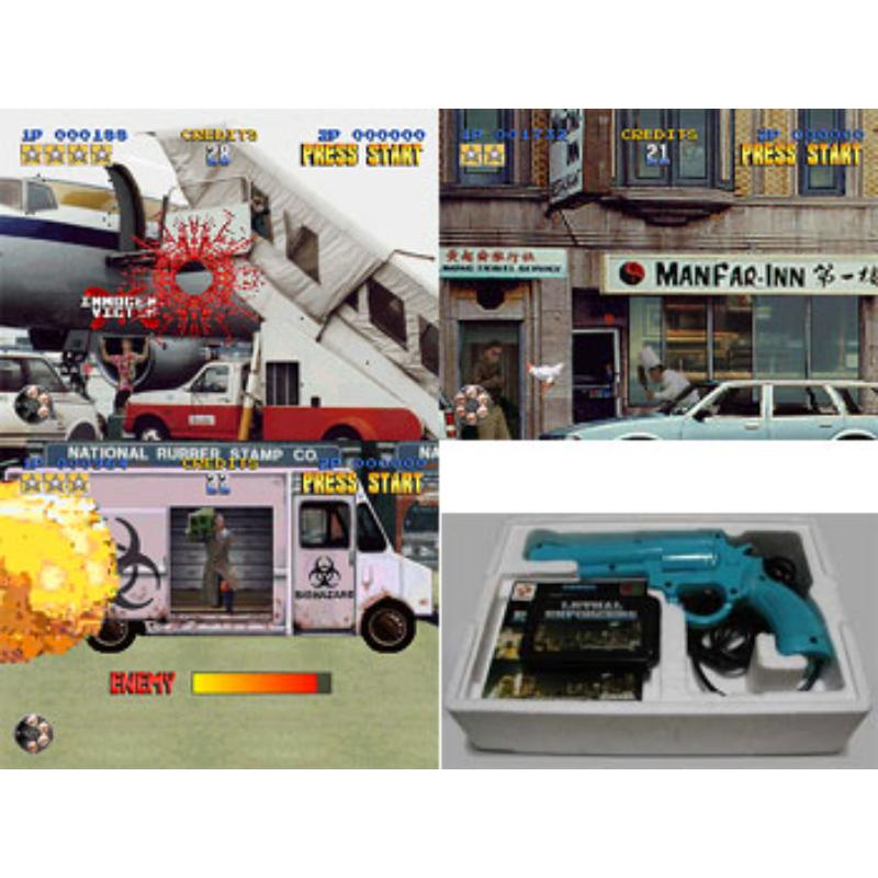 Second hand. CD and lightgun package. Couple of slight disk scratches and light manual impressions. Complete with registration card. Wear and scuffing on box edges. Please note: the light gun wont work with Projection TVs, Plasma TVs, LCD TVs, High Vision TVs and Widescreen TVs besides some models older than 1993. Requires a cathode ray TV to use the gun controller.