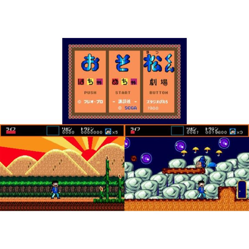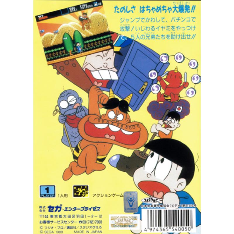 Action platformer starring well known manga man Osomatsu kun and featuring a colour introductory manga in the manual. The game itself doesn't disappoint with creative and liberal use of colour either capturing the madcap essence of the source material well as Osomatsu kun visits shops and spends time on slot machines to break up the platform quest. Some fine power ups too including Japanese mustard to scare off enemies, octopus legs to speed up attacks and a priest's cape and hat for invincibility.