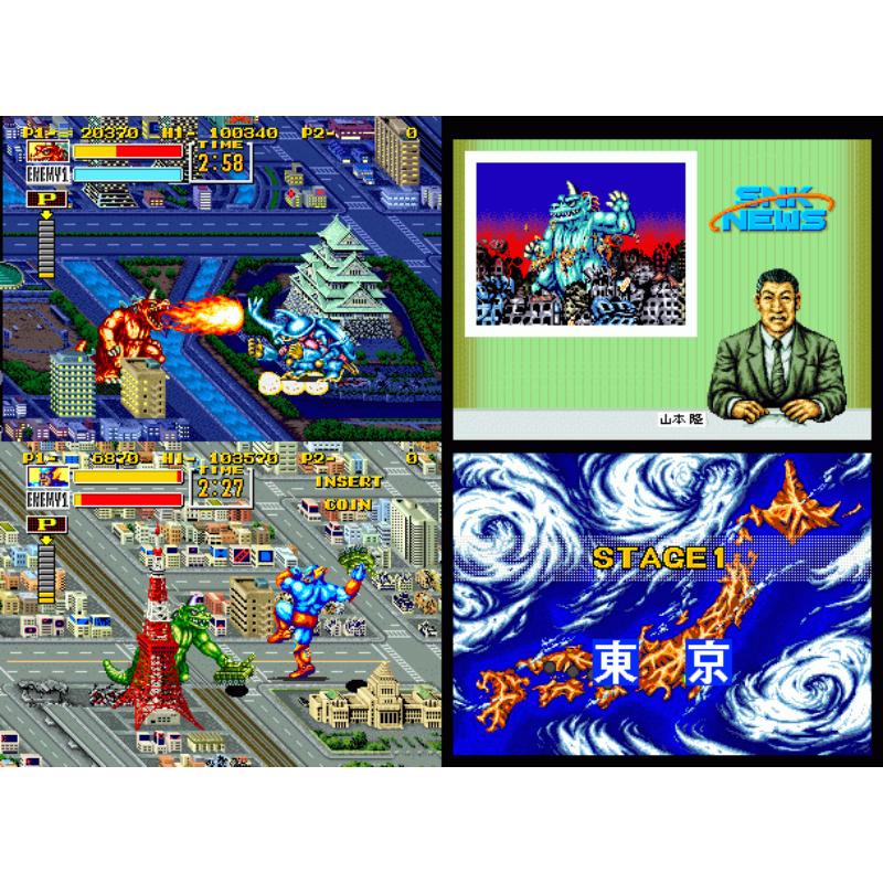 Destroy cities whilst wrestling Godzilla like monsters in this Neo Geo classic. Towering skyscrapers can be tossed at opponents and each monster has its own special energy zapping move. Tidy controls as players crash down buildings on each other as well as utilising their monsters special manoeuvres. Pesky humans interfere but can easily be dispatched with a swipe of the tail.