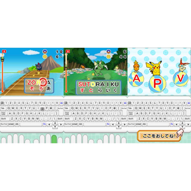 Utilising the wireless and rather snazzy keyboard, players type in the Pokemon Monster names as fast as possible in order to progress and capture them. The monsters can later be viewed in the form of a notebook like a true scientist. The names appear above the monsters in both hiragana and in English giving players of any nationality a chance to compete and boost their speed typing at the same time. As with all fine Nintendo titles the tutorial helps no end.