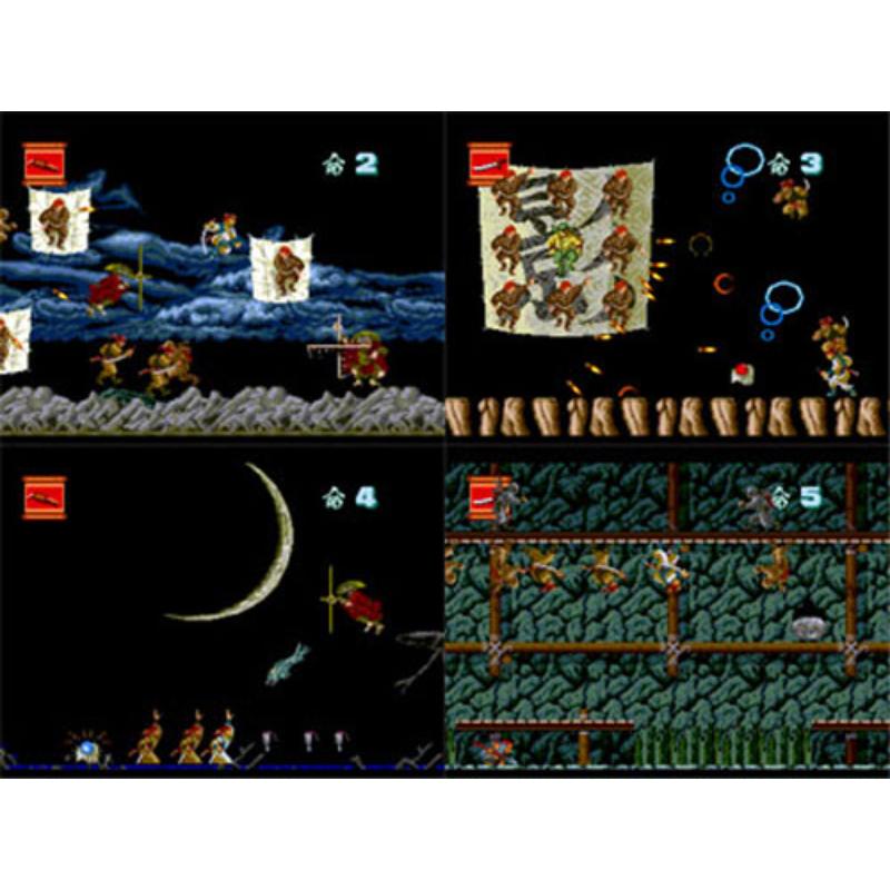 Competent arcade conversion with PC Engine mode giving you a more realistic chance with extra lives for those yet to master the art of ninjitsu. Four weapons to assist you in your quest to avenge your brother's death: sword, shuriken, bombs and chain whip. Some towering bosses dwarfing your character with a Buddhist flavour add much to the moody Eastern atmosphere.