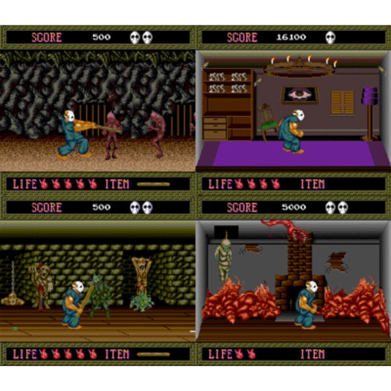 Gory platformer from a golden arcade era before Biohazard was even a twitch in a mortuary. Friday the 13th style lead character fighting all manner of undead zombies and pretty disgusting adversaries not so easily identified. Not quite as arcade perfect as the FM Towns version, but never the less a true PC Engine classic.