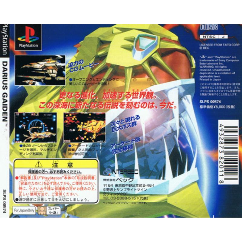 The PSX version adds a very fancy intro to the Darius Gaiden legend and keeps the arcades simultaneous two player mode.. A very unique feel. The robotic cat fish is a Genki favourite. And with twenty eight zones to the seven stages, it never need play the same way each time.