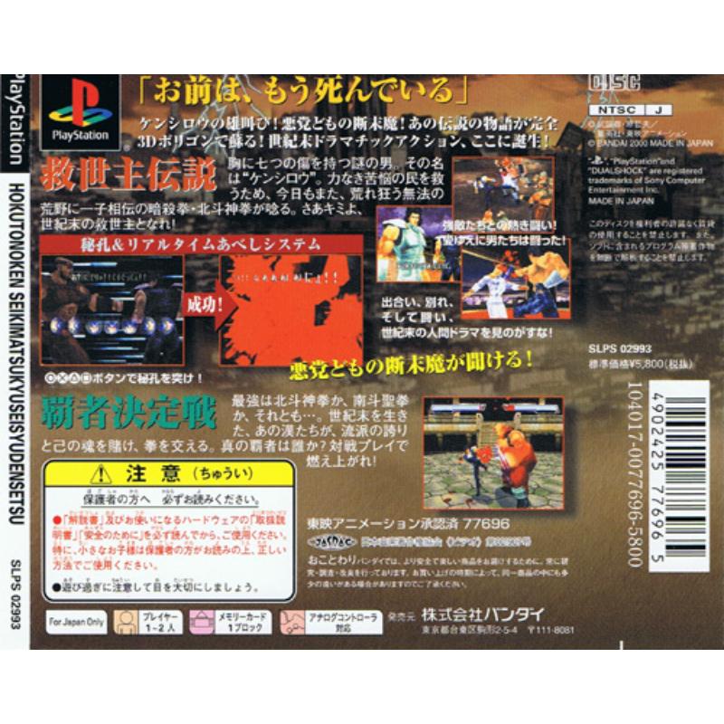 A very stylishly executed one on one blood bath with executed being the operative word. An extreme level of violence remains true to the source material. And its an impeccable level of achievement with it being blatantly obvious the amount work having gone into making this a really special tribute to the license that holds its value very well down the back street game store. Some really gory finishing moves can be unleashed with dexterous button sequences. And the design of the in game pugilists is of such a standard that they are used for the cut scenes. Players can unlock a movie-making mode for real fans of the series and there is also a time attack mode which sees our Kenshiro seeing just how many foes can be dispatched in a minute. Subtitled Seiki Matsuyu Seishu Densetsu.