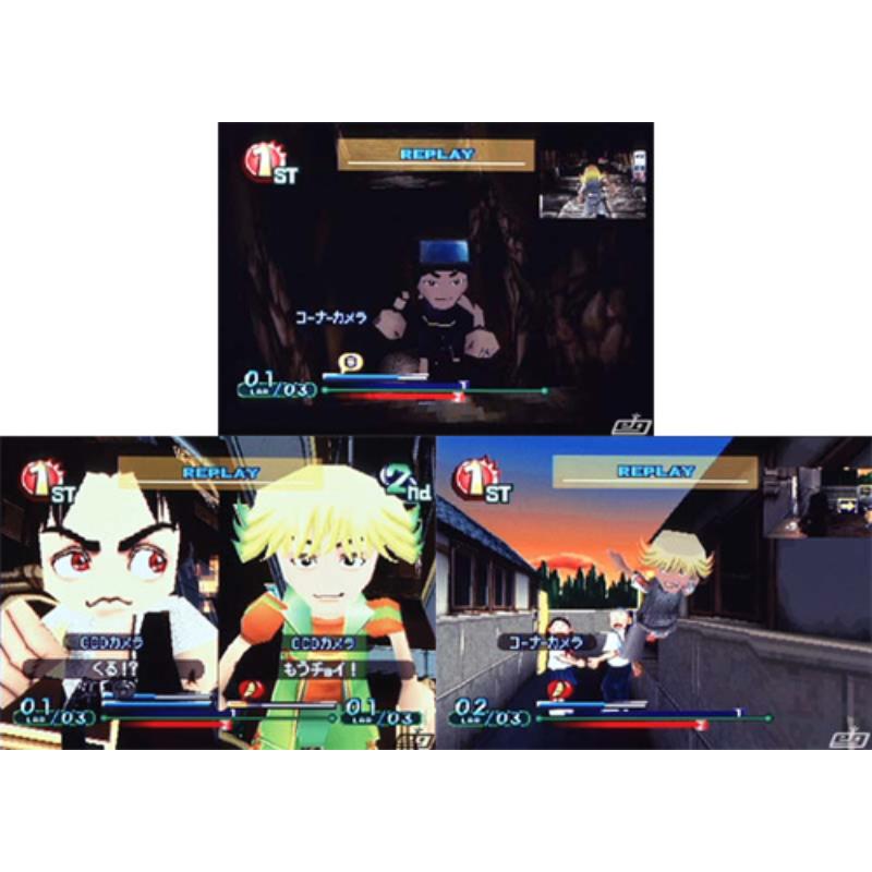Madcap melee of a foot race game in which players charged round the devious courses avoiding the attacks of fellow competitors and trying to use fulcrum grabbing techniques to swing round tight corners to avoid loosing momentum. Based on a well known J Pop band, the action is frantic but very enjoyable as on course hazards are avoided requiring precision jumps with no time to even blink. Subtitled L'Arc-en-Ciel vs Tomarunner.
