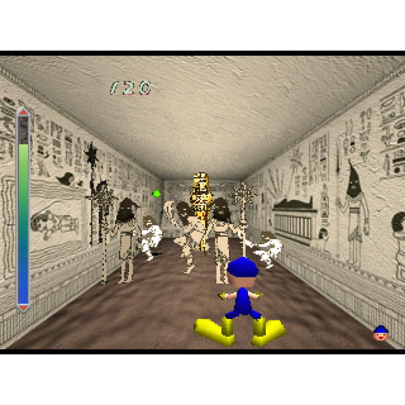The player fires a rebounding projectile into the 3D screen in a Cosmic Smash style game of squash. Enemies must be hit including bosses who can chop down on you in the foreground and obstacles must be jumped over.