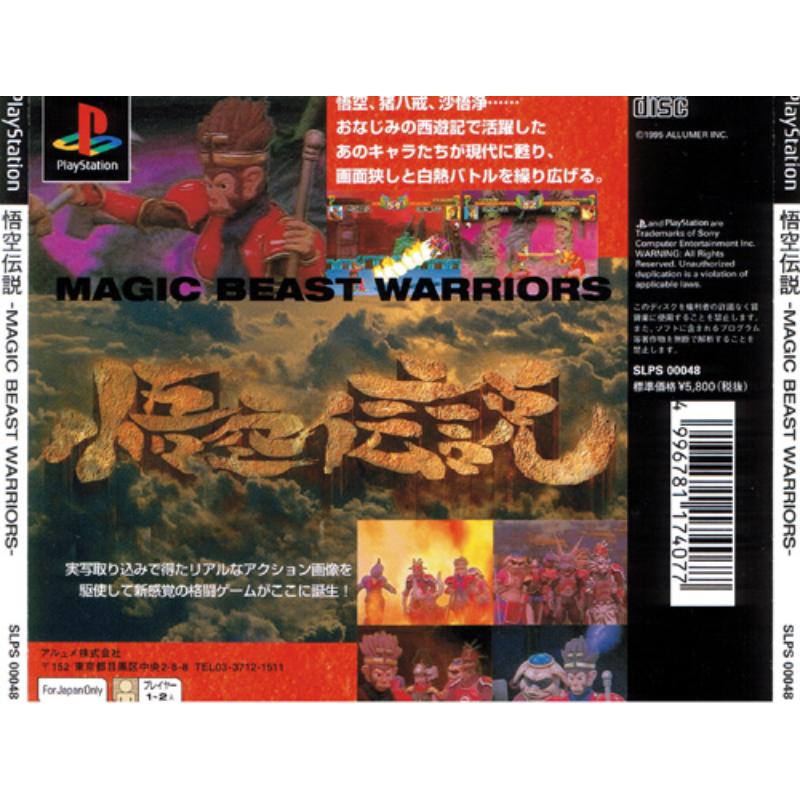 A rare find but an absolute treat for the 2D fight fan: manna from heaven for the Monkey fight fan. Featuring some excellent, cheesey FMV complete with suspicious special effects and costumes introducing the nine characters and also awarded for victory in the versus mode. In story mode you start off playing as Son Goku (Monkey) with additional defeated characters available for selection on your quest to rescue the priestess and prod around the evil multi limbed demon kidnapper. Gameplay is made more enjoyable down to the simple specials which are more suited to the Playstation controller. And aurally its very enjoyable with some appropriate rock riffs and over the top special effects. Japanese title: 'Goku Densetsu.'