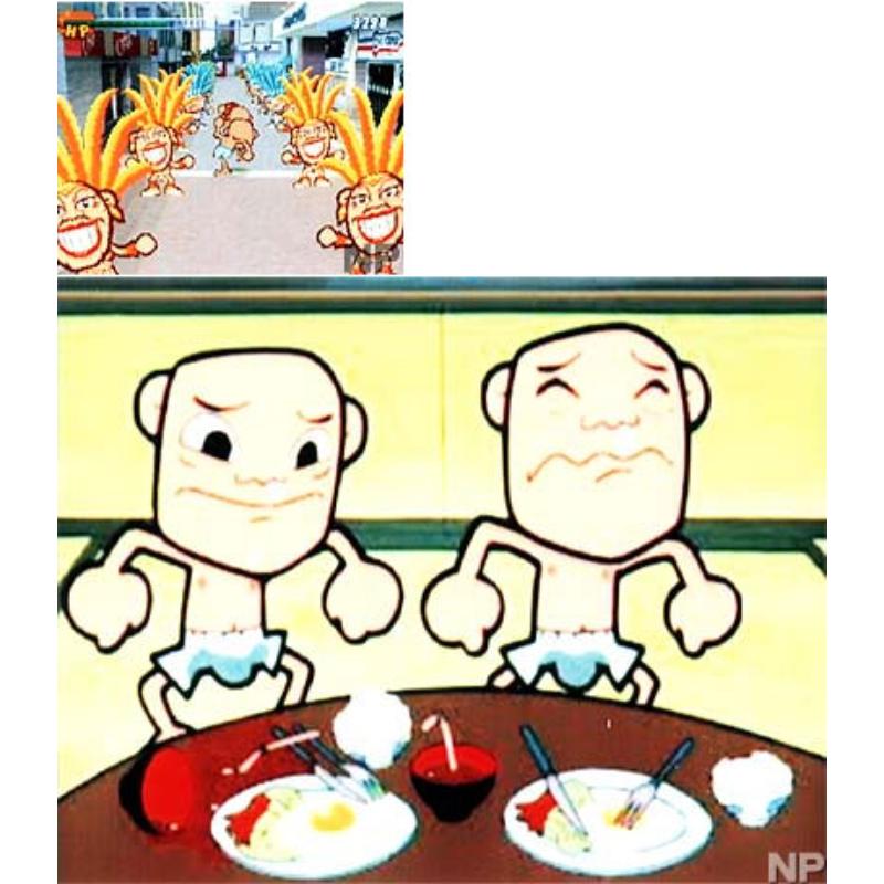 A finely sliced raw piece of Japanese programming with gameplay on the brink of insanity as players manoeuvre three characters down the road avoiding obstacles such as the on coming traffic and fellow pedestrians whilst topping up the health metre by munching hamburgers (and avoiding the dangerous puffer fish burgers.) Successful completion of a section leads to some bonkers mini games to keep players entertained. Controlling multiple characters is challenging, but adds to the unique feel. Bonus battle and love modes where the boys and girls scrap it out (and vice versa) are the icing on the rice cake.