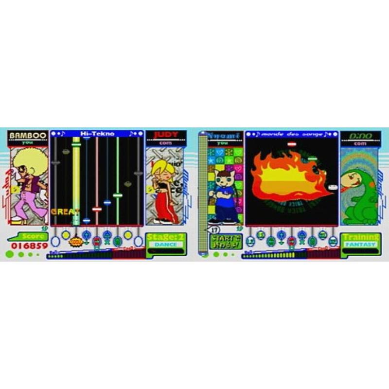 Rhythm based action which is great fun all wrapped up in Konami's friendly and cuddly graphical style hiding the killer app underneath. Animated characters represent your on-screen persona and react according to how well you are into the groove with successful beats getting a little dance of celebration. Fine J Pop tinged tracks in there but a good variety from tub thumping techno to cheesy anime theme tune.