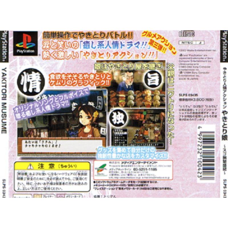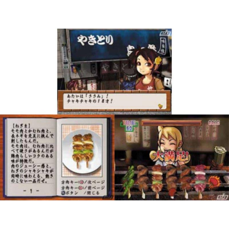 In a similar genre to Ore no Ryori, you play a young girl who must serve customers skewers of grilled chicken. Each stage has a time limit in which you must generate sufficient customer satisfaction through correctly preparing the chicken skewers: be it heart, bone, or skin. Get on a good run of customer karma and you become 'invincible' for a short time with the customers devouring anything you throw at them: cooked or raw. A great relief from frantically fanning the coals to generate a bit of heat.