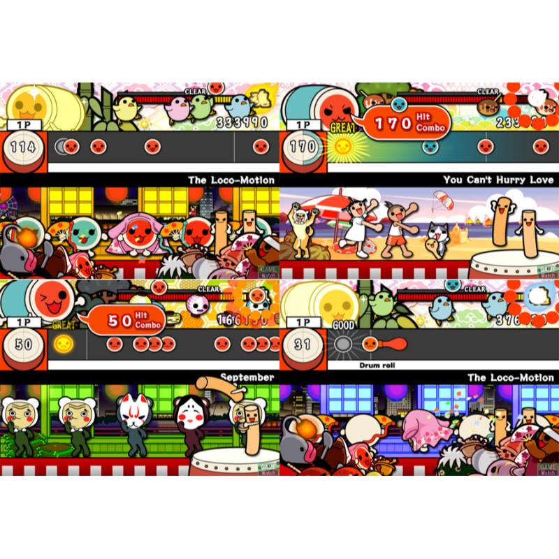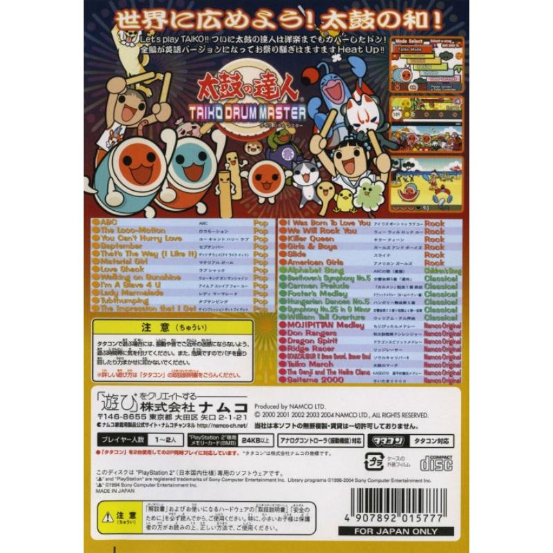 Japanese release of the tub thumping American version which is best played with the Taiko Controller: hit in certain parts in tune to the on screen action. Wide spectrum of songs from Ridge Racer to Beethoven via Walking on Sunshine and Killer Queen. Three mini games too: a watermelon eating contest, a firework festival and a dog escape to a helicopter. Undeniably bizarre with smiling squids, dancing dogs and samurai turtles; but when it brings a Japanese festival into your home it can't be bad. Also known by its Japanese name Taiko no Tatsujin.