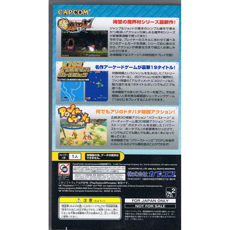 Very collectable demo disk for Capcom to show off its PSP wares with Goku Makaimura (Ghouls and Ghosts), Power Stone and 1942 from its Capcom Classics Collection in demo form. Happy days!