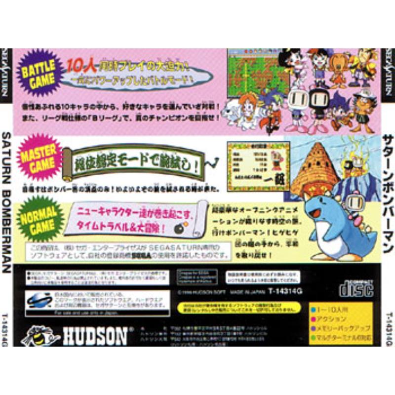 Second hand. Saturn Collection version. Requires two multitaps for up to ten player mayhem. Featured in the "Five Most Collectable Games", Edge Saturn Collector's Guide. Light manual cover impressions.
