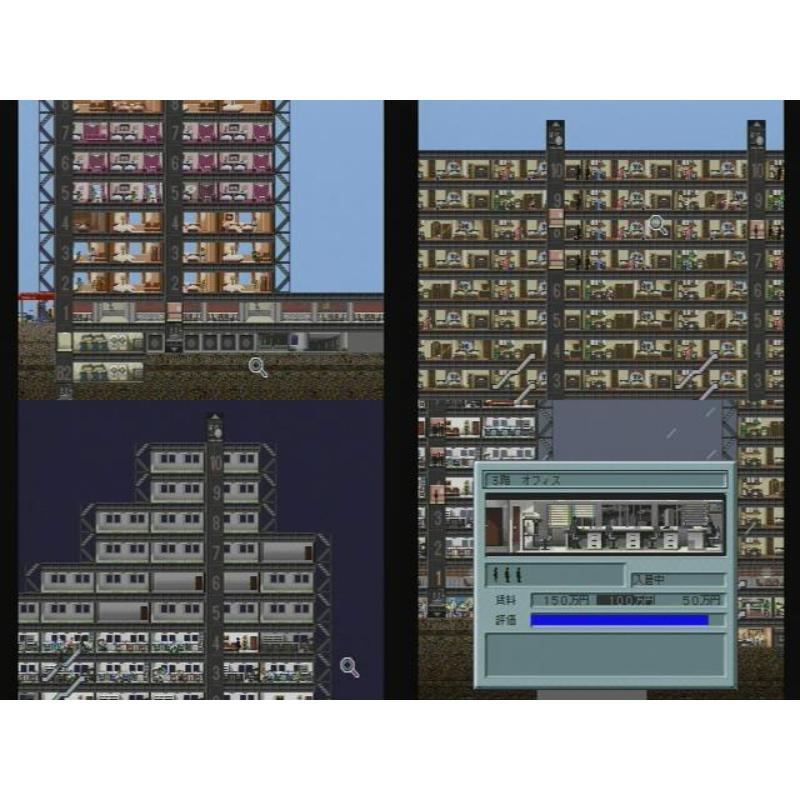 Captures the market in sky scraper sims in one swoop as players build up their dream tower from the base up and get to add delightful extras such as the office, the noodle shop, the hamburger bar or even the bag section of a department store. Then the ambitious architect can sit back and enjoy the results like little computer people watching the good folk go about their business.