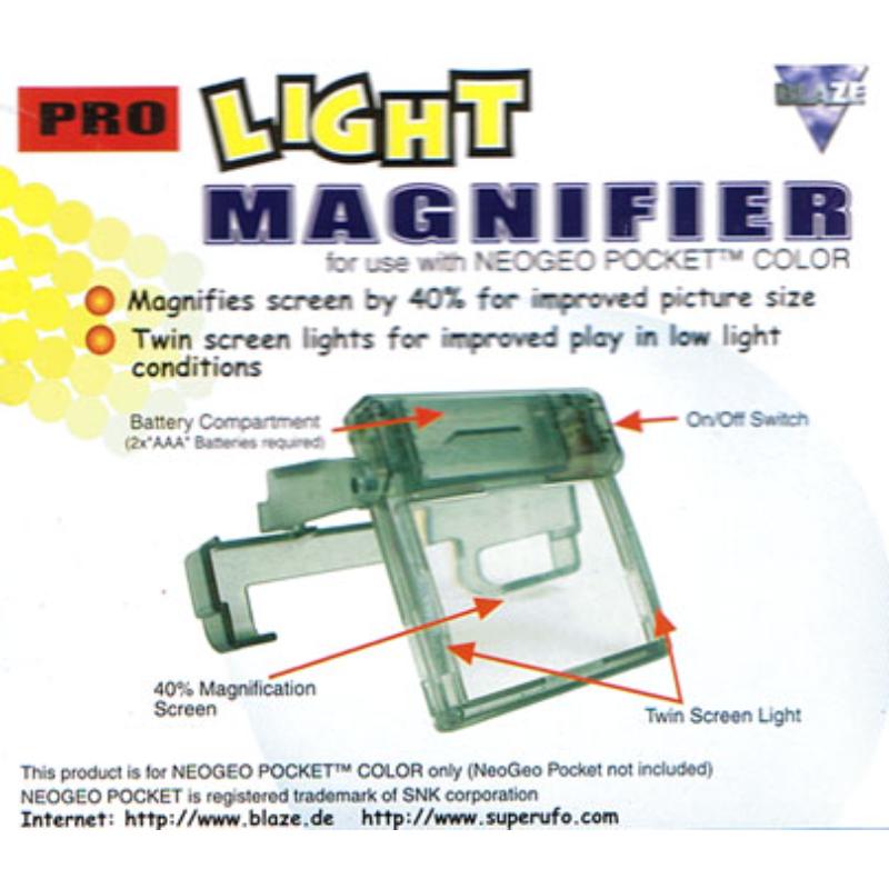 Third party mini light (requiring 2xAAA batteries, not supplied) with magnifying glass boosting screen appearance by forty percent. Perfect for those precision putts on 'Big Tournament Golf'. Only compatible with the Neo Geo Pocket Colour.