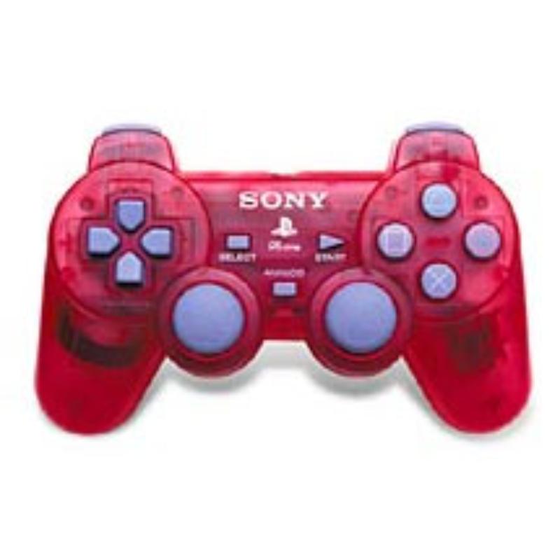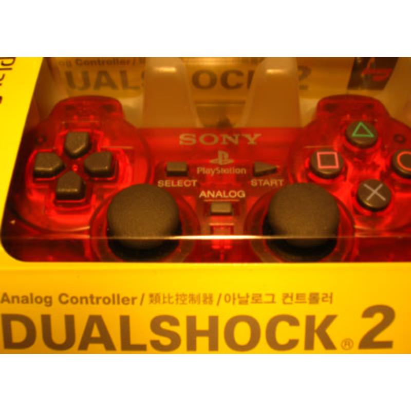 Firey red coloured Sony joypad for the PS2 or Playstation with vibration function. Nice translucency effect showing the internal circuitry that would make the PS2 hardware proud.
