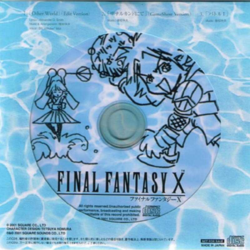 Composed by the talented Nobuo Uematsu, this is a Japan exclusive promotional preview disk of the FFX music. Presented in a very tidy and highly collectable blue slipcase which has super deformed pictures of Yuna and Tidus on it. Otherworld and Zanarkand have been shortened in their epic length and it also includes a version of Battle One.