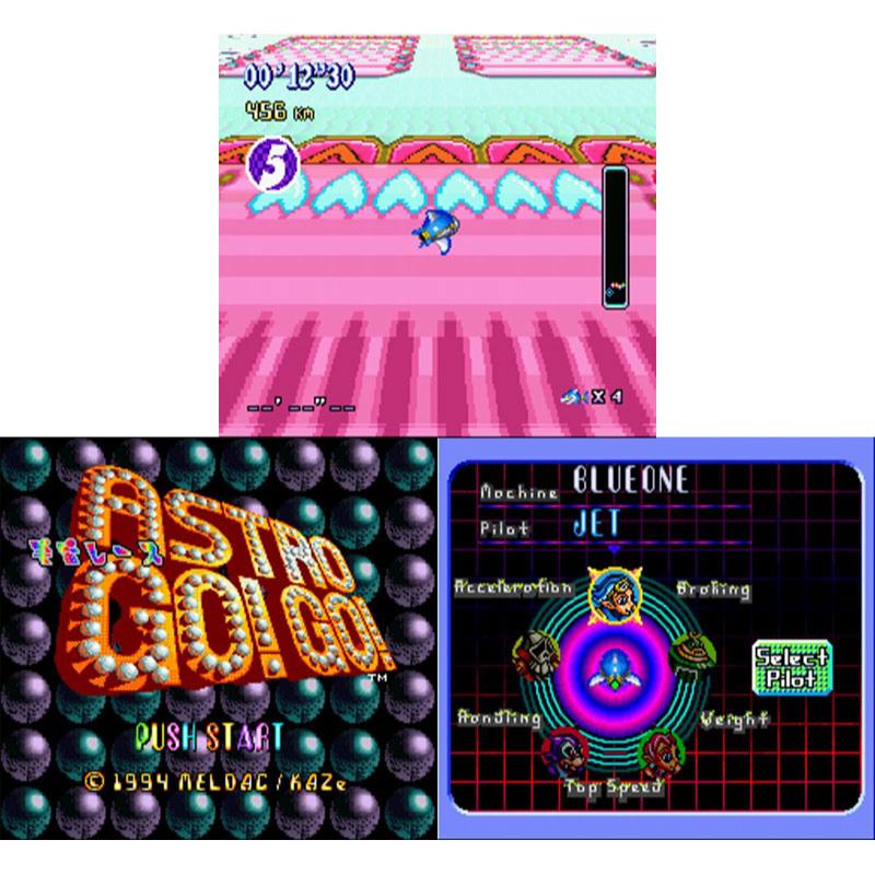 F Zero style racer with a medley of psychedelic racers looking like a futuristic take on the Tetsuwan Atom series. The game positively zips along with plenty of colour used in the tracks as well as the racers outfits.