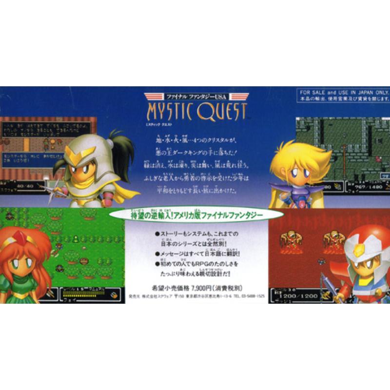 Designed with non-RPG gamers in mind making Mystic Quest an easy entry expedition as the young lad to tries to restore parity to earth by reuniting the four crystals. Ogres can be clearly seen removing the bug-bear of random battles that is prevalent in most RPG's. And the combat is enjoyable with the battle scenes executed with panache as you may expect from a triple-A developer. Terrains to are skilfully sculptured with ice and volcanic levels looking breath taking. And the characters designs and emotive soundtrack bear all the hallmarks of a class act. Full title Final Fantasy USA Mystic Quest.