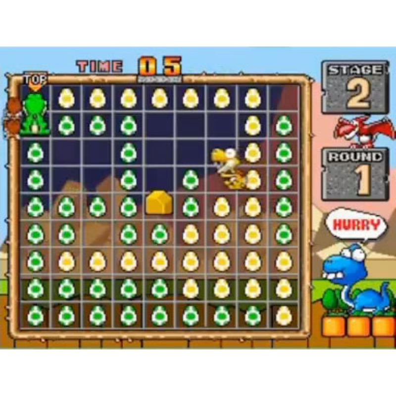 Players take on the role of dinosaur and plod around the maze area to lay eggs of their own colour and snaffle up their opponents colour. The winner is the layer of the largest number of eggs. Known as Hungry Dinosaurs on the SNES.