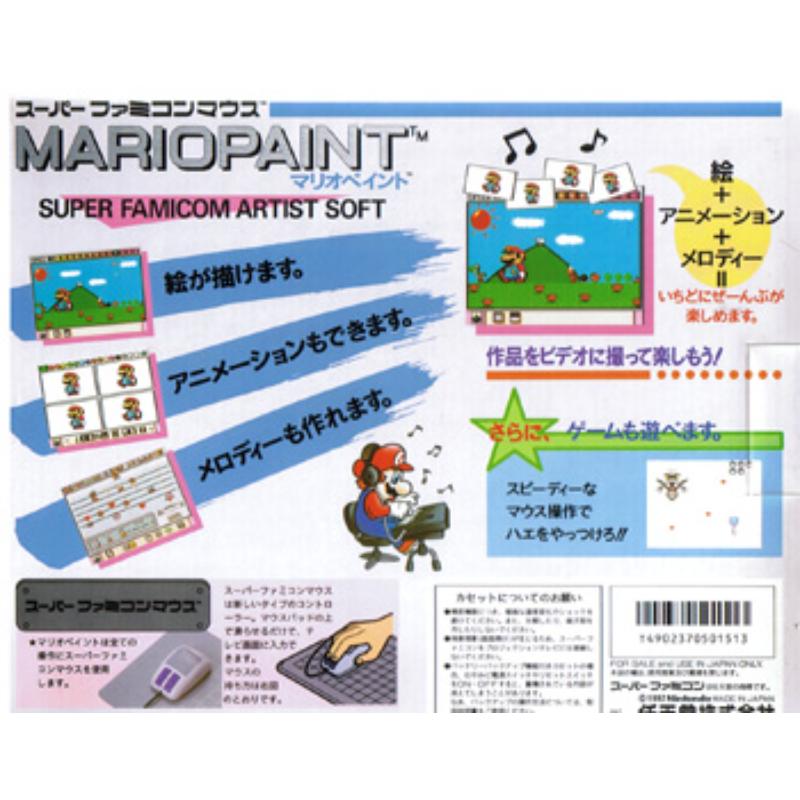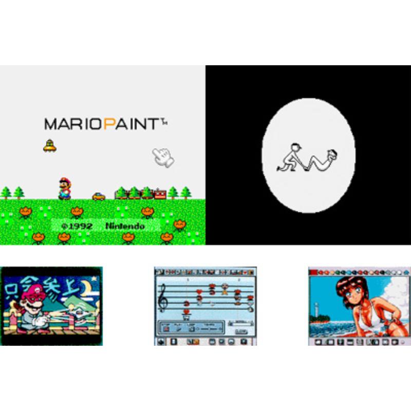 Paint package for the Nintendo which utilises the mouse very well and has slick presentation as you'd expect for a Nintendo title. As a Mario game very collectable too. Not only drawing facilities but you can produce animations and music too with colour in pictures of Mario for the less budding artists. Also includes an insect swatting game to improve mouse skills.