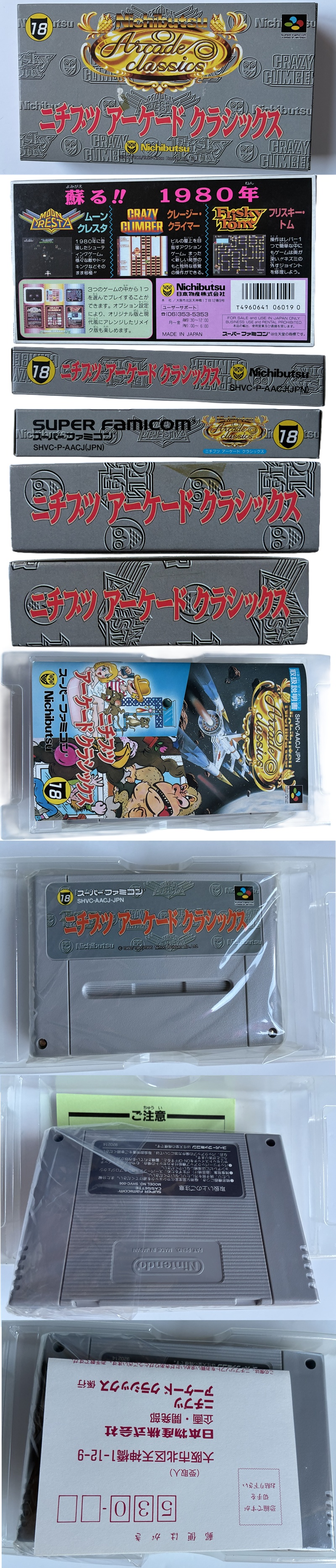 Contains three arcade classics on the one cart: Moon Cresta, Crazy Climber and Frisky Tom. So we have a pre-Galga shooter with the steady hand eye co-ordination required for the docking levels, a climbing game where opening windows, flying plant pots and bird droppings conspire to hinder your progress to the top of the building and finally a puzzler where the water pipe must be repaired to help the fair lady get her shower. Quite a mixed bunch then.