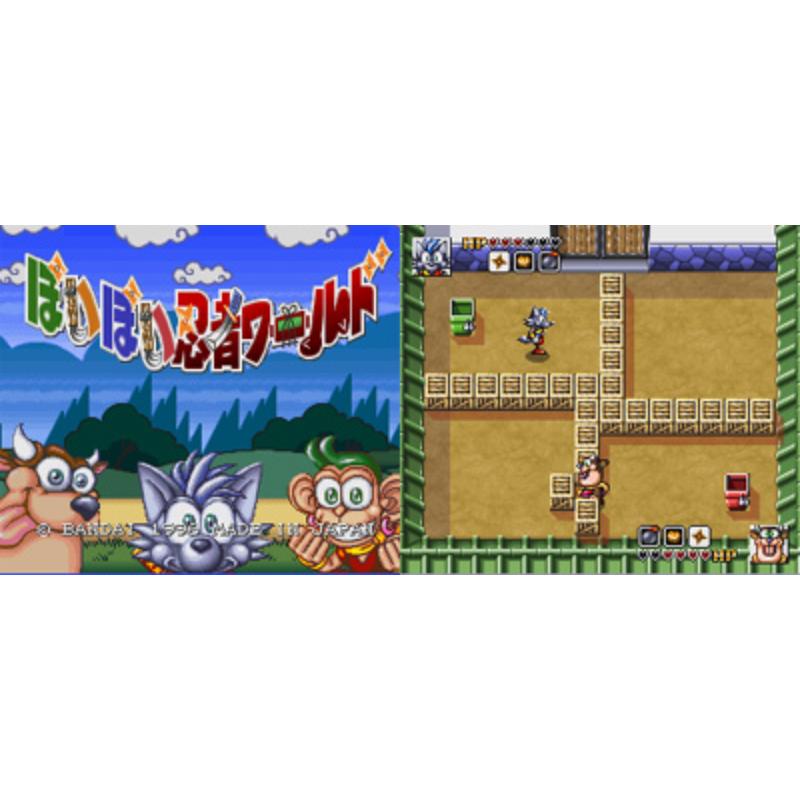 The Sufami Turbo plugs into the cart slot of the Super Famicom allowing you to play Bandai's anime themed releases that came on smaller, cheaper carts through it. Two games can share each others resources when utilised together opening up secrets. This ninja game is a battle between up to four players using bombs and throwing stars in the Bomberman mould.