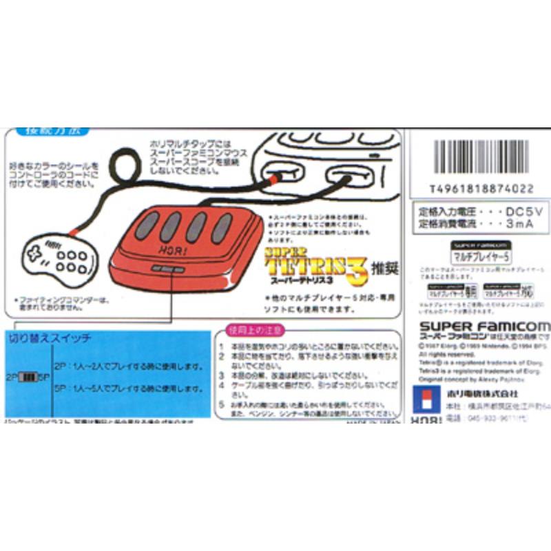 Super Tetris 3 themed multitap with two or five player switch for mass Bomberman match ups and delightful summer games of tennis doubles and Pimms. Sturdily bulit in a Super Famicom game size cardboard box.