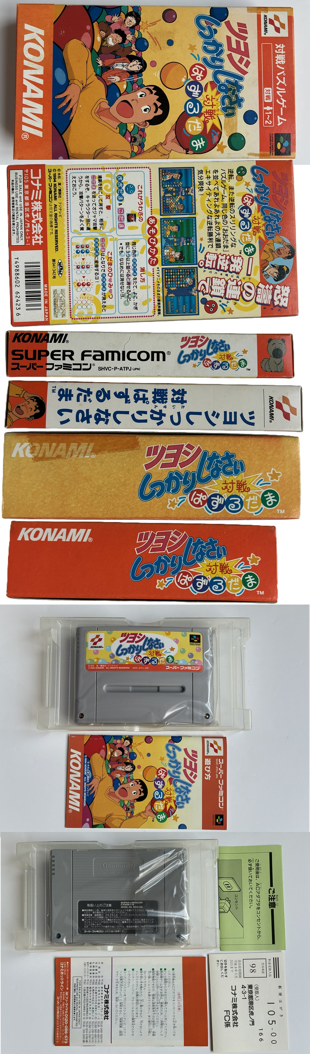 Colourful characters as bright as the descending spheres which send immoveable blocks raining down on your opponents side of the screen. Plenty of emotion in both victory and defeat with Konami's polish in presentation in ample evidence. Full title: Tsuyoshi Shikkari Shinasai Taisen Puzzle Dama (or loosely translated as: Sort it out Tsuyoshi.)